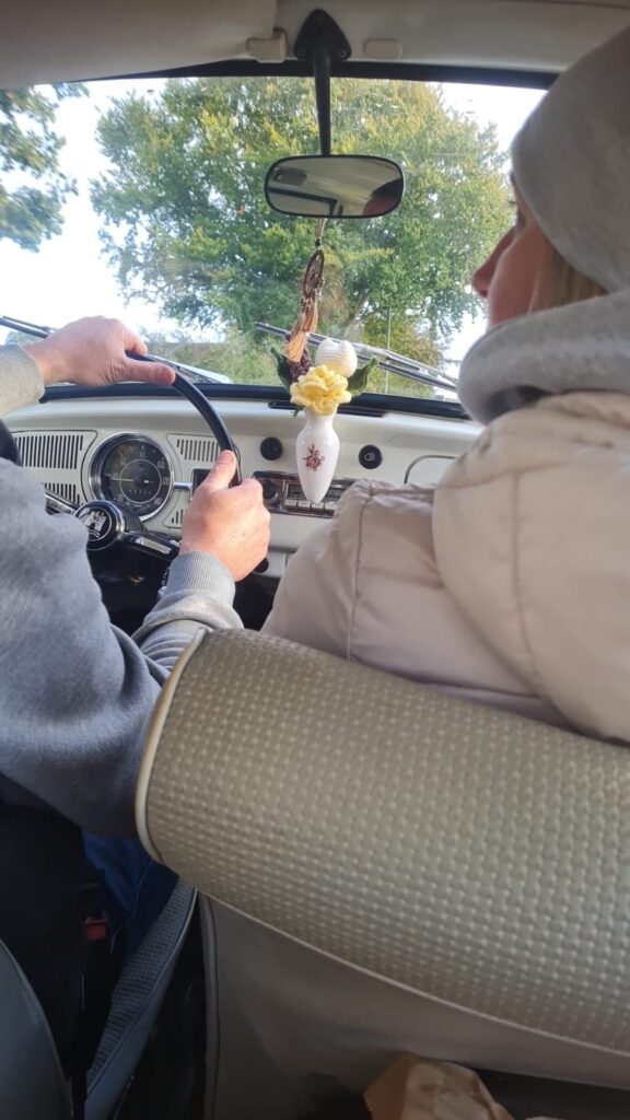 Und tatsächlich: Wir haben es geschafft. Eine gemeinsame Fahrt in meinem VW Käfer. Ein ruhiger Moment, voller Erinnerungen, Motorengeräusch und einem Lächeln, das mehr sagte als viele Worte.